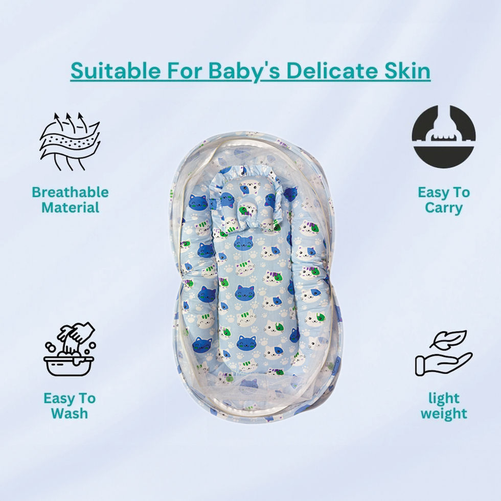 Sleep is the most essential activity for all babies.SnugBaby soft & comfortable Mattress set is specially designed for baby comfort and peaceful sleeping. Ensuring your baby gets ample rest every time, this baby mattress is made with premium quality fabric which creates a cozy little cocoon for your baby. It is has elevated structure at the sides for providing Protection when baby moves in his/her sleep. Made from premium quality cotton fabric, the mosquito net safeguards your little one from insects and mosquitoes. Made from 100% Soft and Breathable cotton at front and back with micro-polyfill stitched in between, this Mattress set gives support to baby body and helps them grow. This Mattress Set consists of 3 articles, 1 Mattress/Gadda (For Comfortable Sleep), Pillow/Cushion (For Supporting baby head), Mosquito Net (Protect your little one from insects).