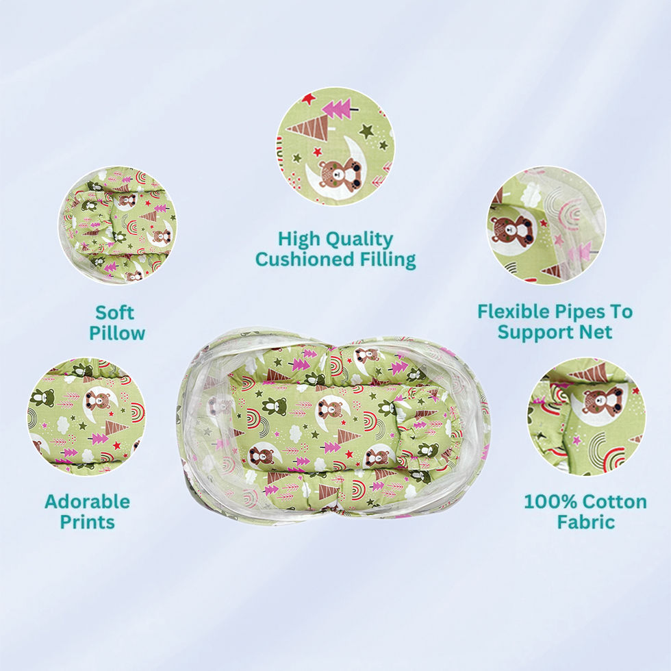 Sleep is the most essential activity for all babies.SnugBaby soft & comfortable Mattress set is specially designed for baby comfort and peaceful sleeping. Ensuring your baby gets ample rest every time, this baby mattress is made with premium quality fabric which creates a cozy little cocoon for your baby. It is has elevated structure at the sides for providing Protection when baby moves in his/her sleep. Made from premium quality cotton fabric, the mosquito net safeguards your little one from insects and mosquitoes. Made from 100% Soft and Breathable cotton at front and back with micro-polyfill stitched in between, this Mattress set gives support to baby body and helps them grow. This Mattress Set consists of 3 articles, 1 Mattress/Gadda (For Comfortable Sleep), Pillow/Cushion (For Supporting baby head), Mosquito Net (Protect your little one from insects).
